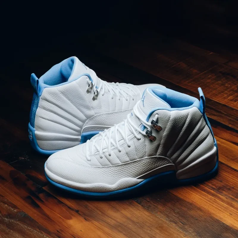Functionality is as crucial as aesthetics for the “Melo” Jordan 12. The shoe boasts a herringbone outsole designed for superior traction, ensuring excellent grip on the court. The sneaker featured a striking design with all-white uppers and University Blue trim on the heel complemented by pops of metallic silver on the eyestays.