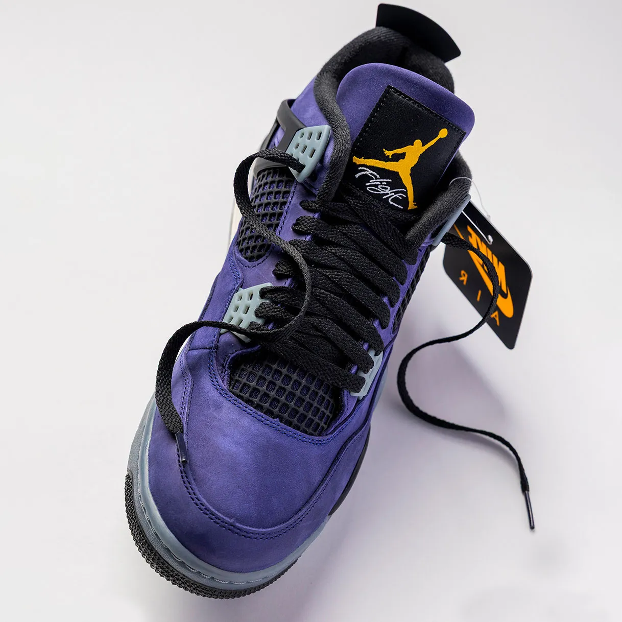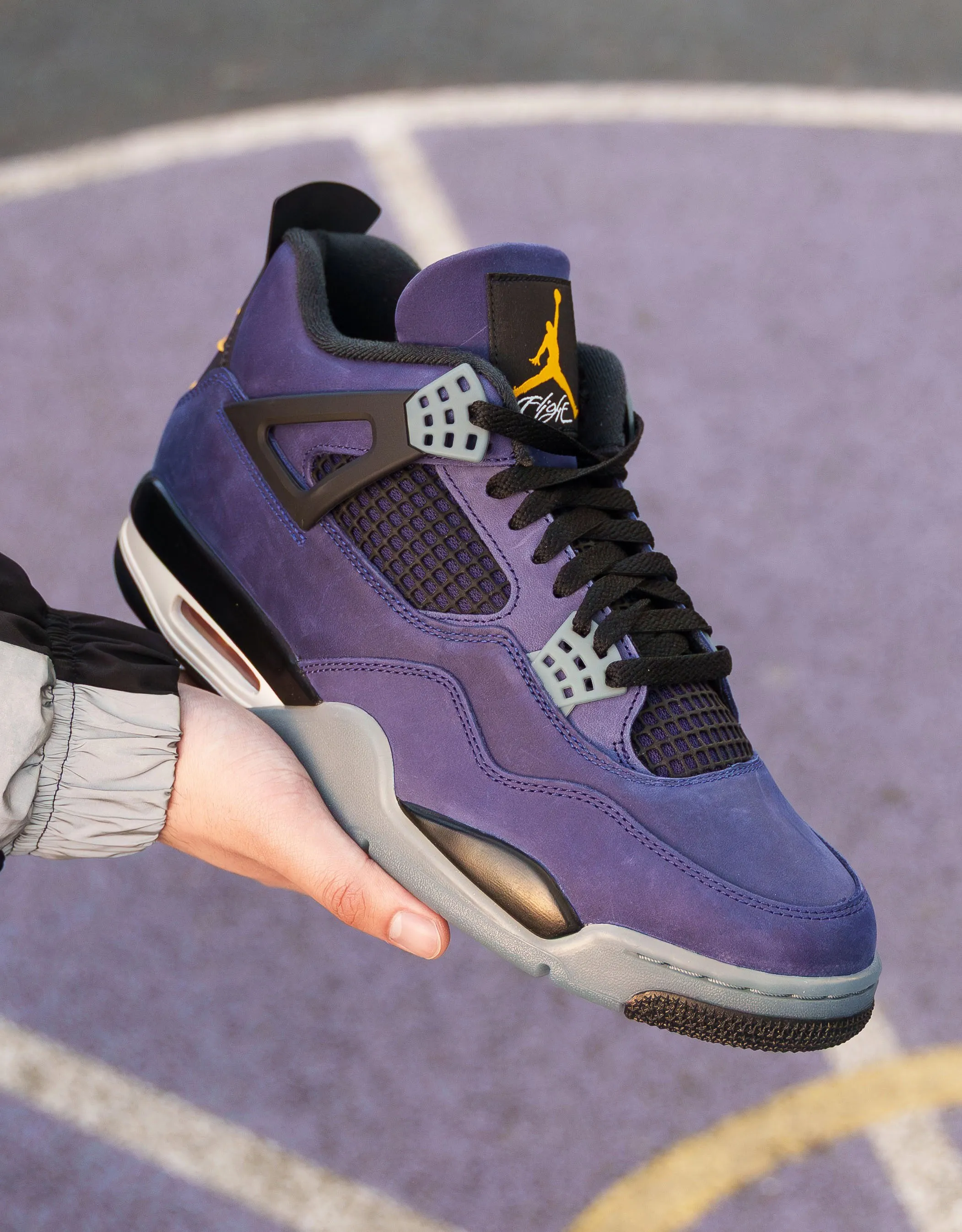 The new AJ4 โLakers/ Lakershow” arrives in a rich Imperial purple nubuck upper, accented with striking gold details across the branding and visible Air unit. The classic AJ4 structure remains untouched – signature mesh panels, bold wing eyelets, and nostalgic Nike Air heel branding. Every detail preserves its 1989 DNA, while the Lakers-inspired palette introduces a powerful new narrative: the meeting of two basketball eras. This isnโt just a beautiful colorway. Itโs history retold through design.